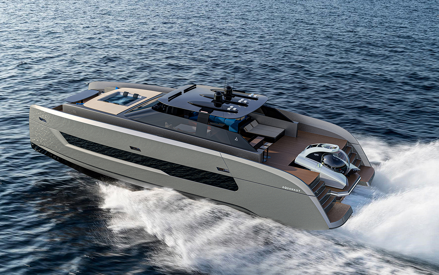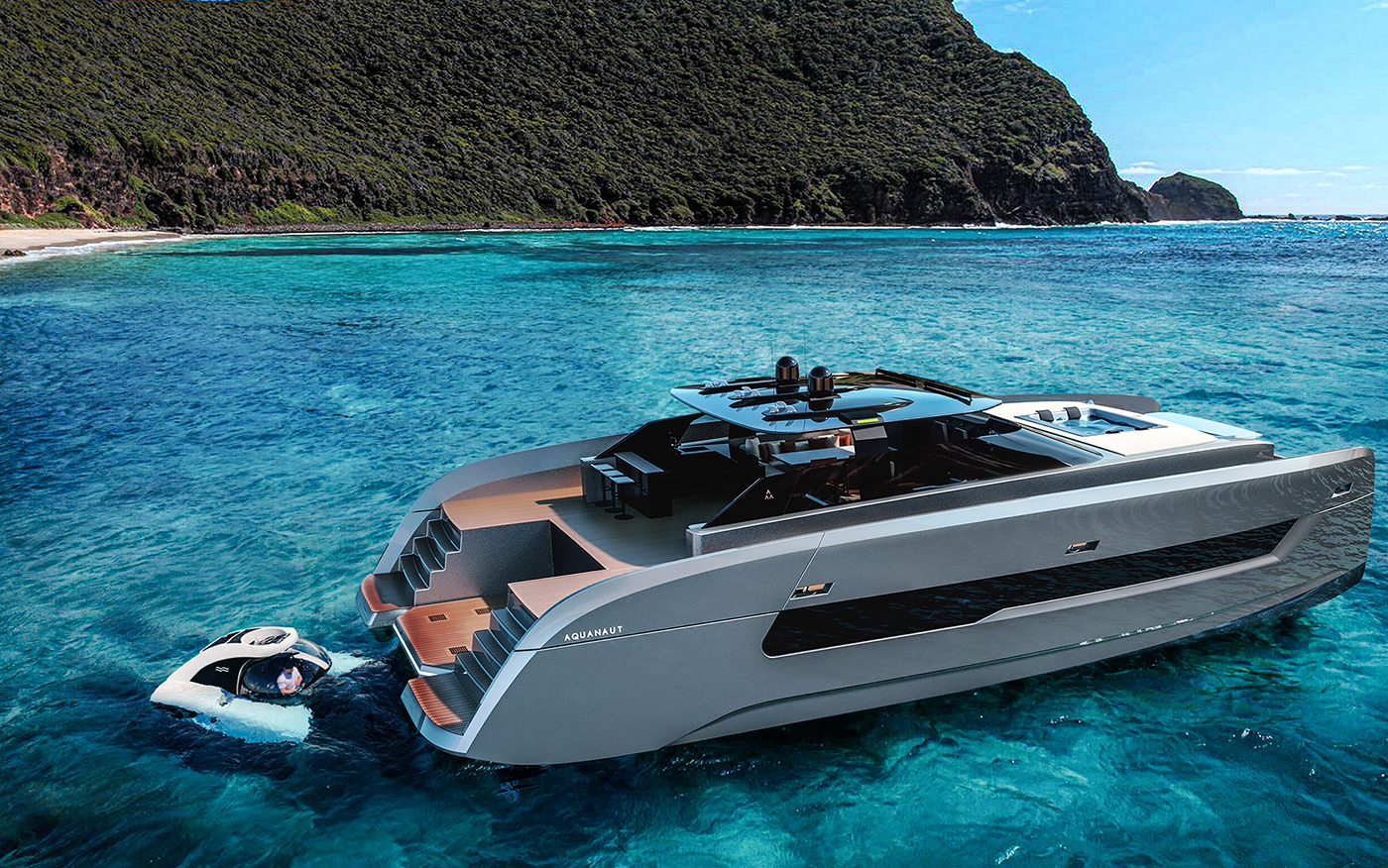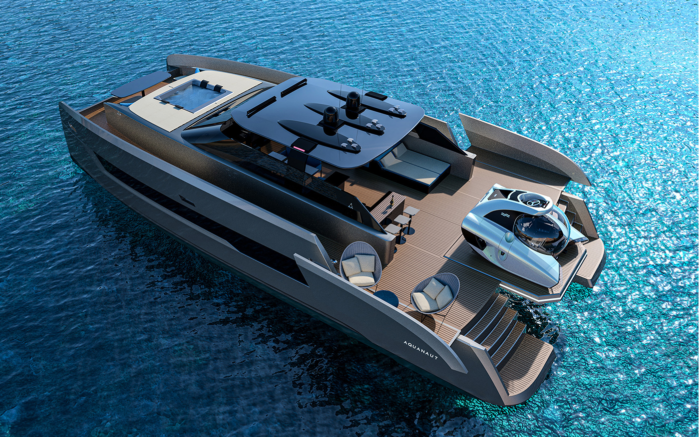 Aquanaut is an advanced multihull catamaran quipped with dynamic inboard propulsion of 2×800 hp to offer an impressive speed potential of up to 45 knots. The moveable platform on the back functions as a multipurpose area that can be lowered for launch and recovery of the submarine. The same space also functions as a beach club arrangement and can be used as a lounge & entertainment area.