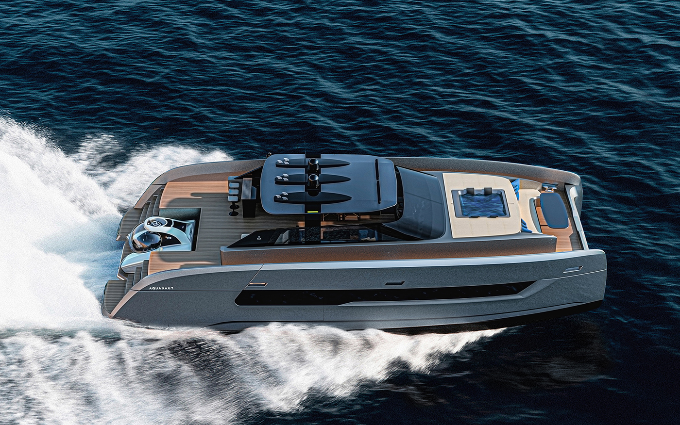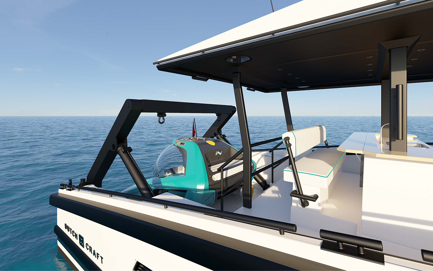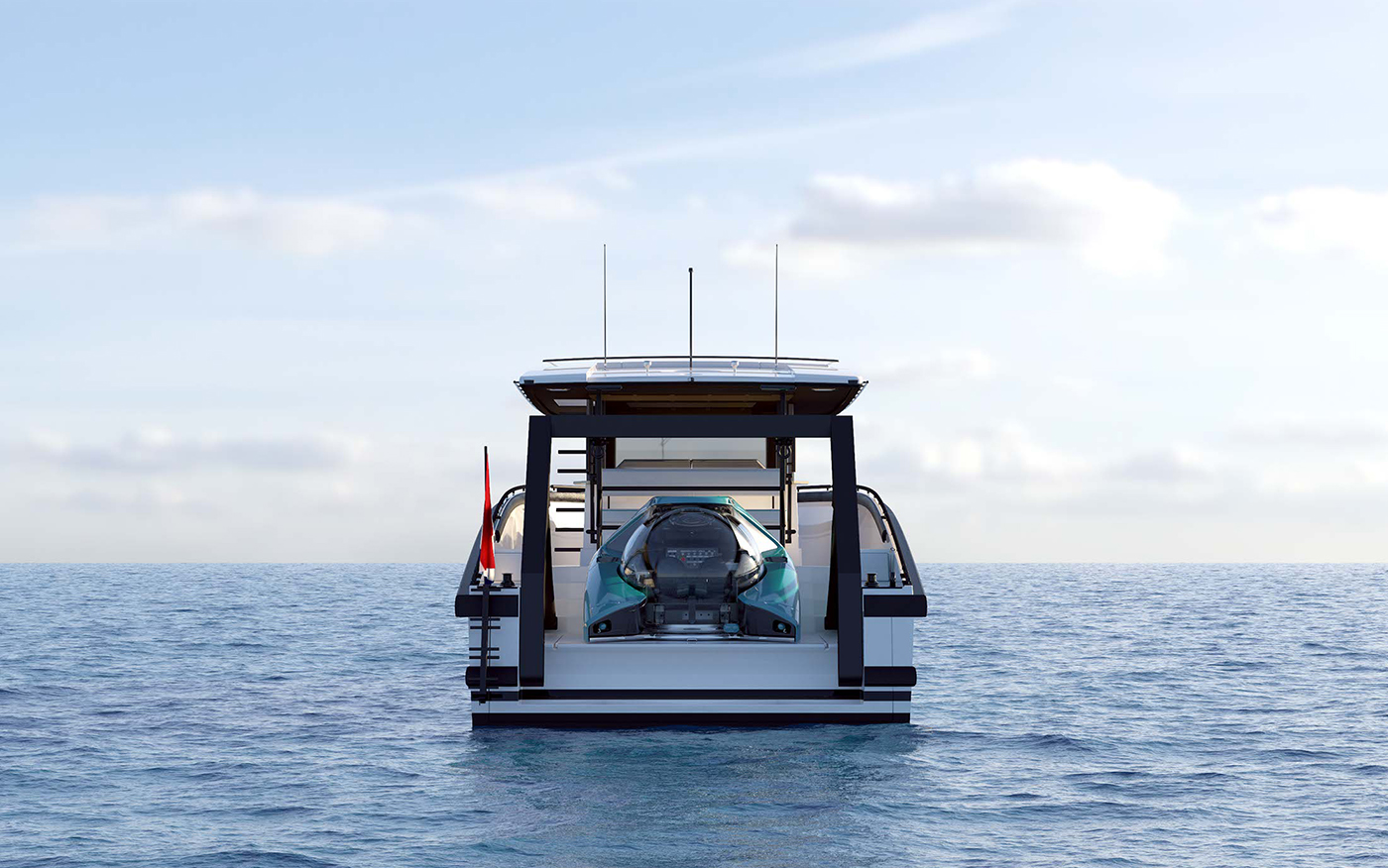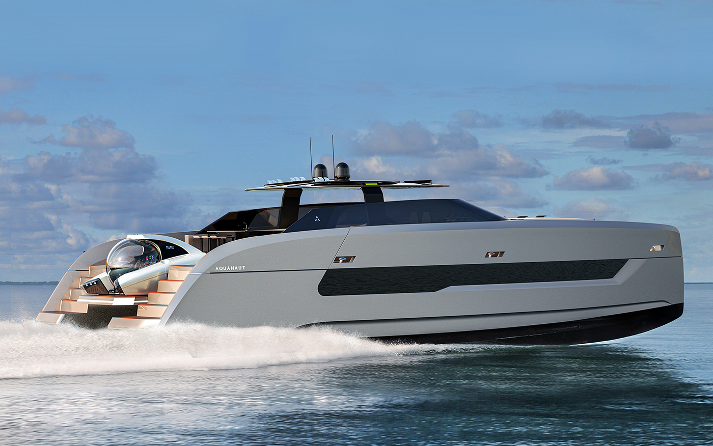 Aquanaut is an advanced multihull catamaran quipped with dynamic inboard propulsion of 2×800 hp to offer an impressive speed potential of up to 45 knots. The moveable platform on the back functions as a multipurpose area that can be lowered for launch and recovery of the submarine. The same space also functions as a beach club arrangement and can be used as a lounge & entertainment area.