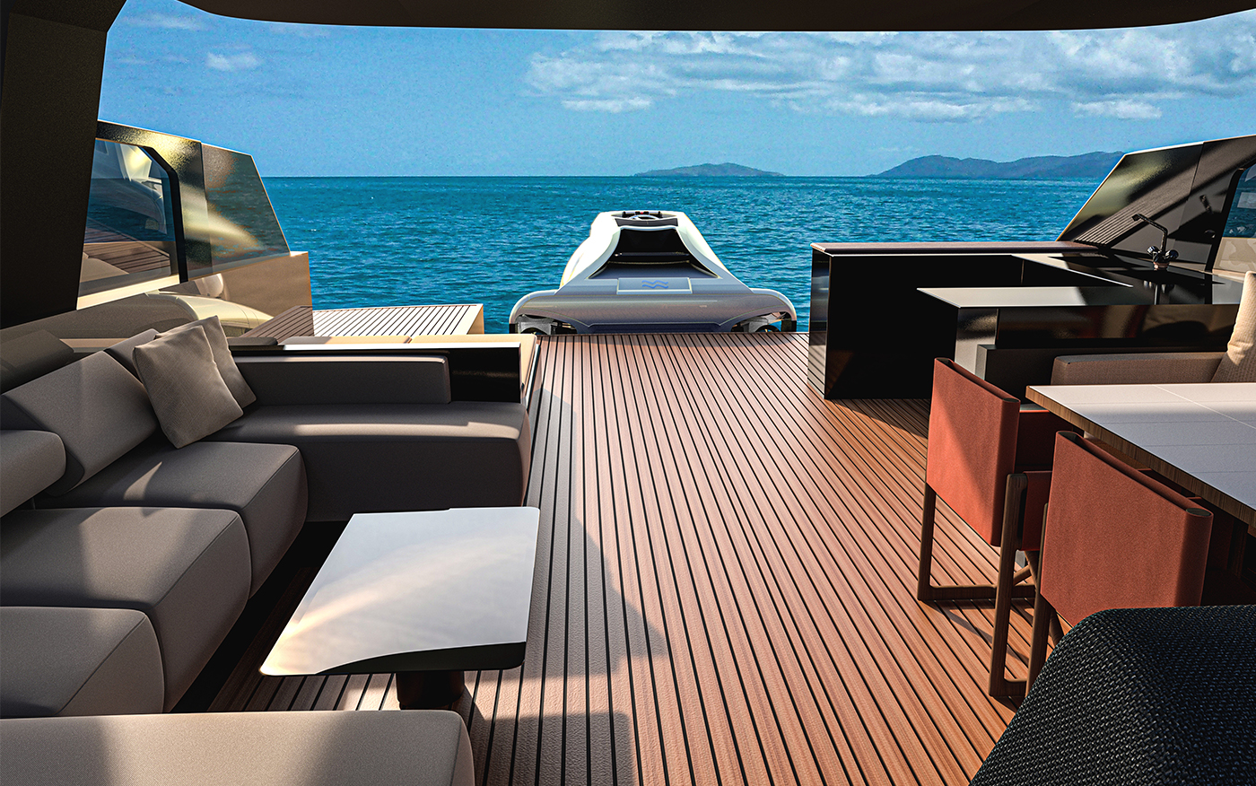 The vast aft deck space by the waterline lends itself to all manner of uses, from fishing platform to socialising space to stowage place for toys and watercraft – even a NEMO. To the sides of this deck, two large benches conceal oversized locker units (6m x 1.65m and 3m x 1.65m) that provide storage for watersports gear and other items, on a scale that is practically unheard of in this yacht size category.